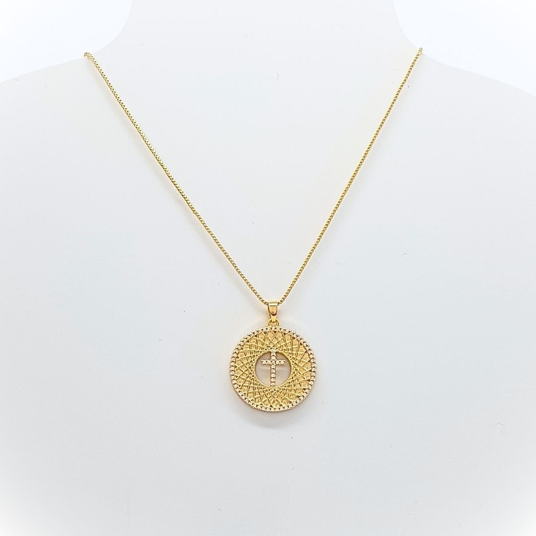 Fio Banhado a Ouro 18K c/Medalha Redonda c/Cruz e Zircónias