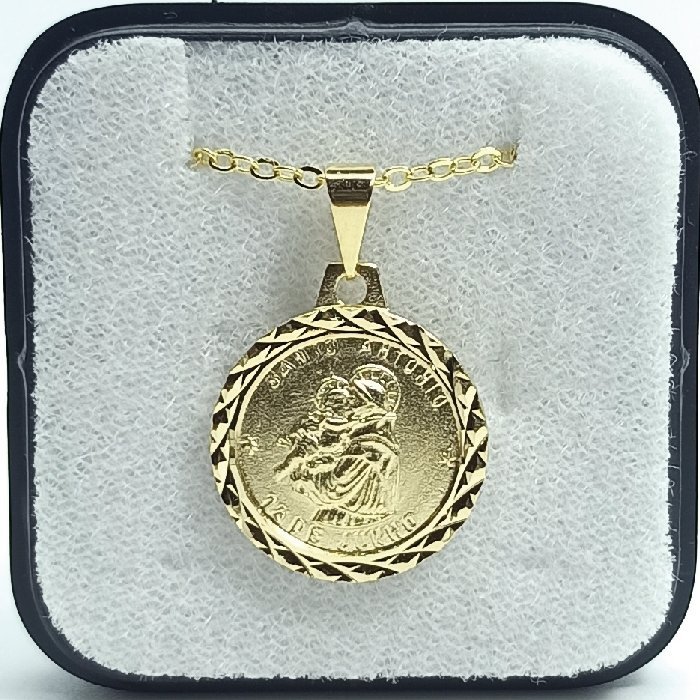 Fio c/ Medadlha Redonda 18MM Lapidado Folheado a Ouro Santo António