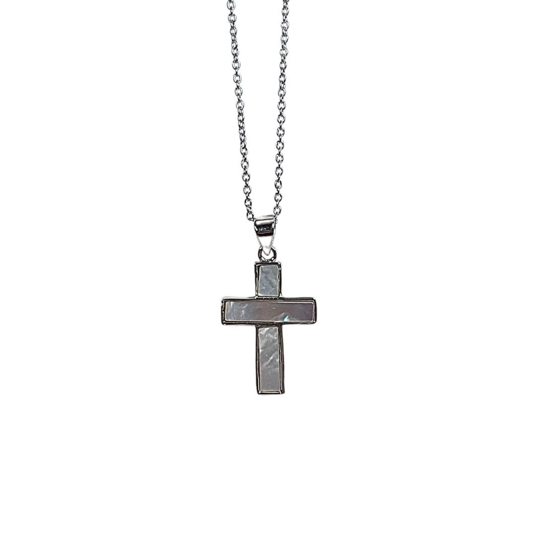 Fio Semi Jóia Prata com Cruz em Madre Pérola, 3cm