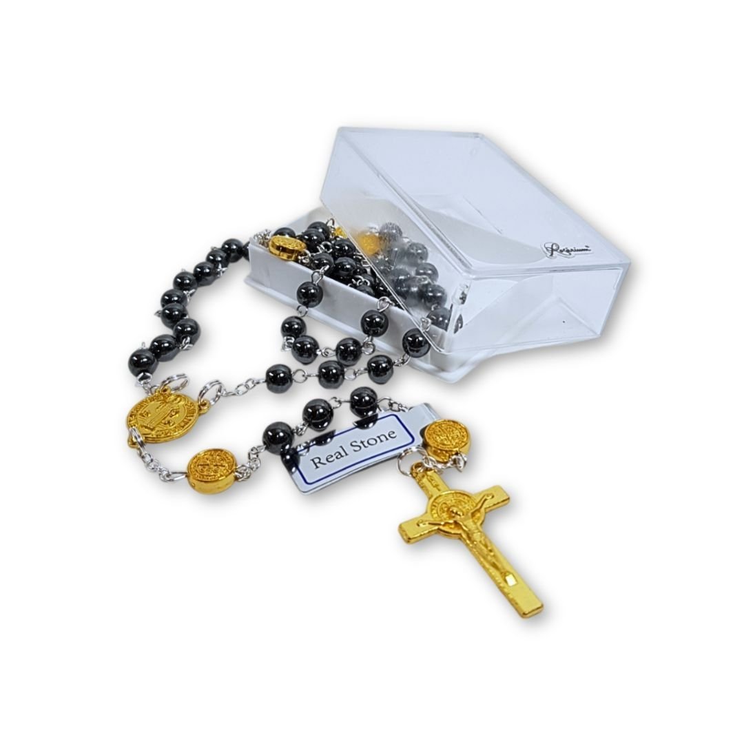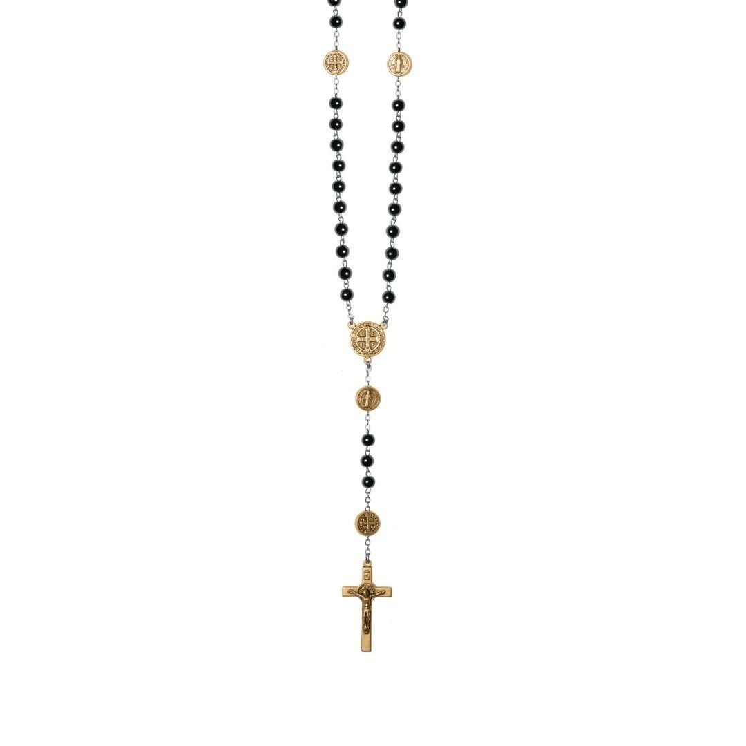 Terço de Pedra Hematite c/Pai Nosso S.Bento Metal, 6MM, Dourado