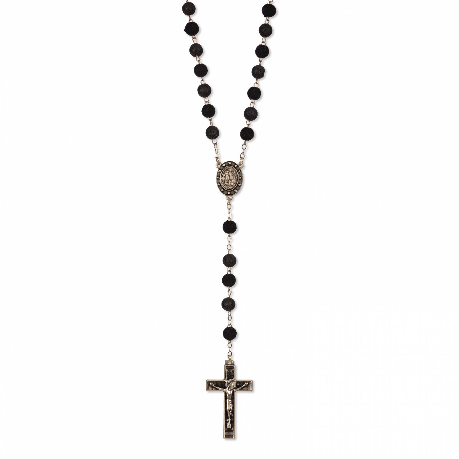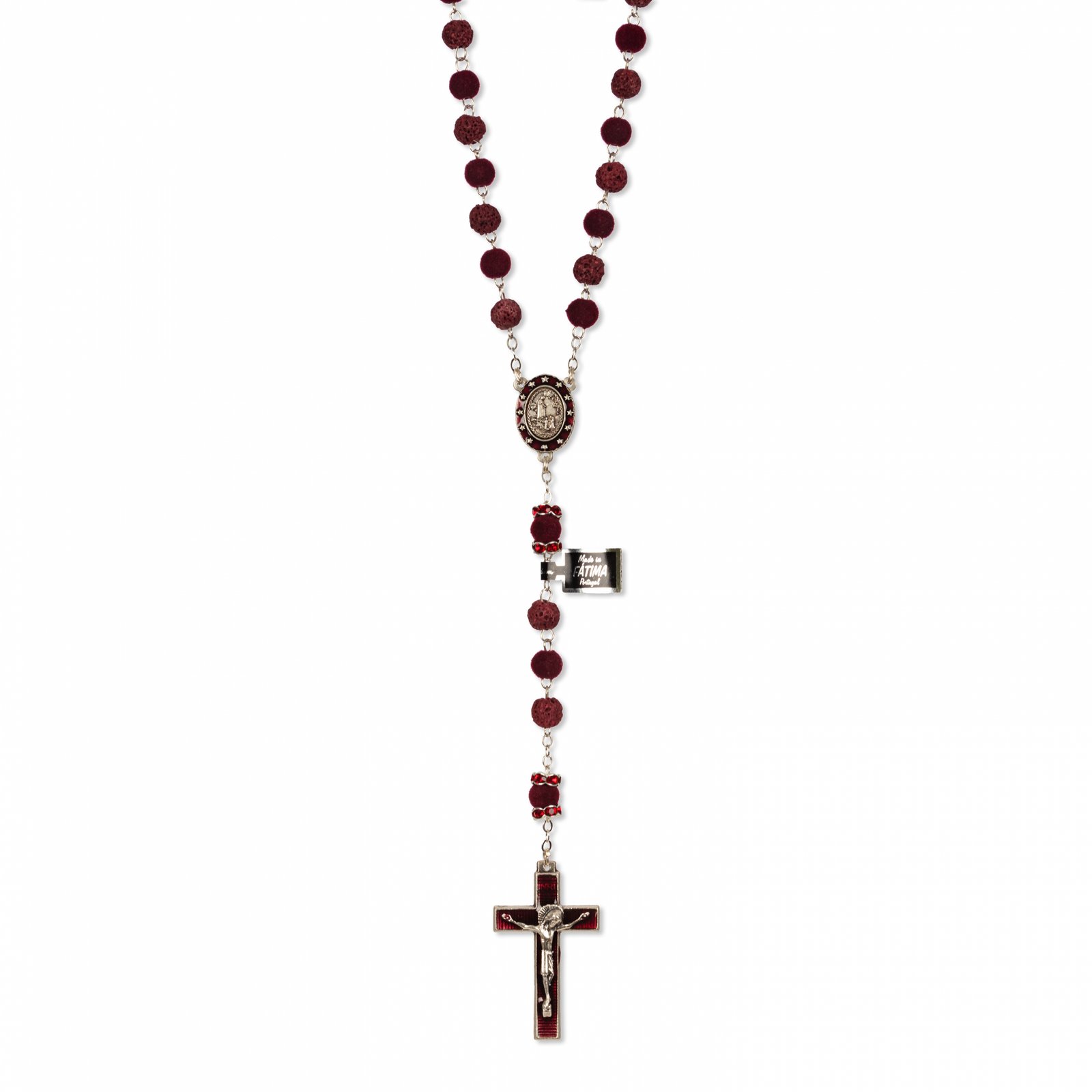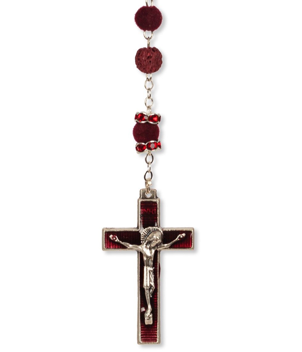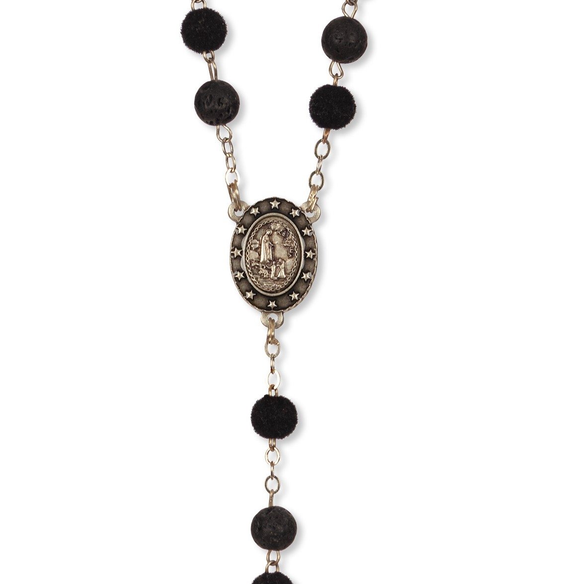 Terço de Pedra Natural Vulcânica de Lava e Veludo c/ Pai Nosso Anéis Strass