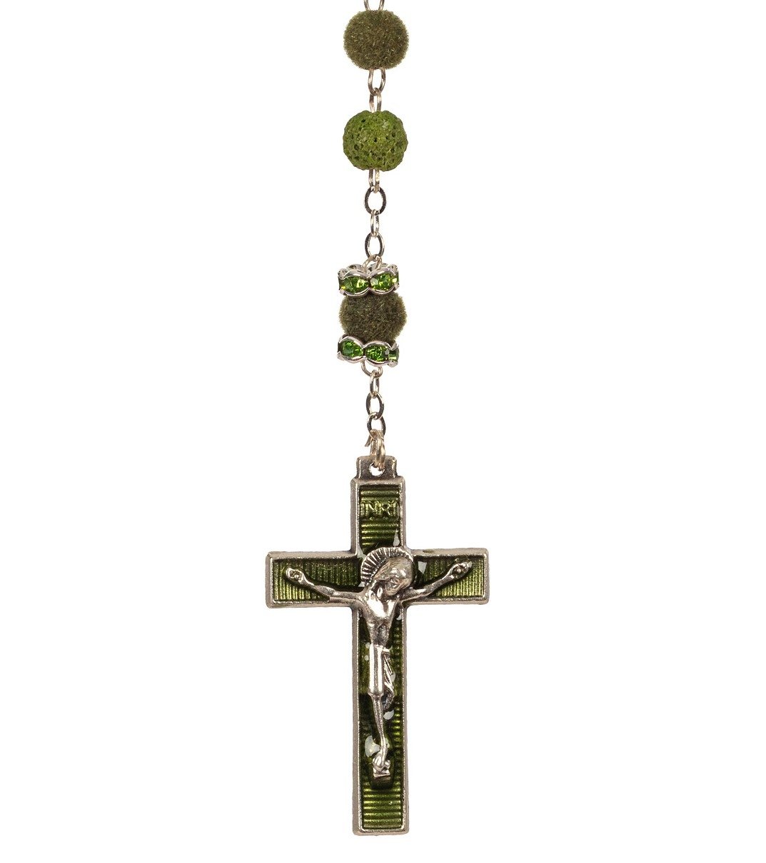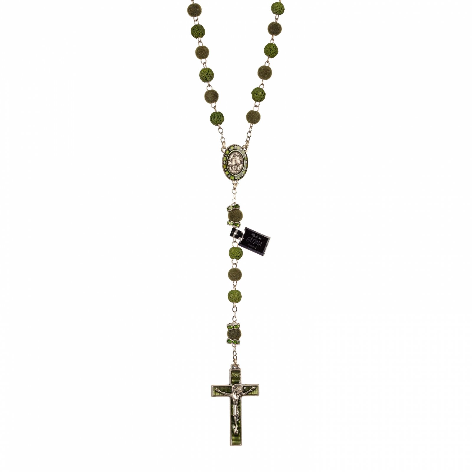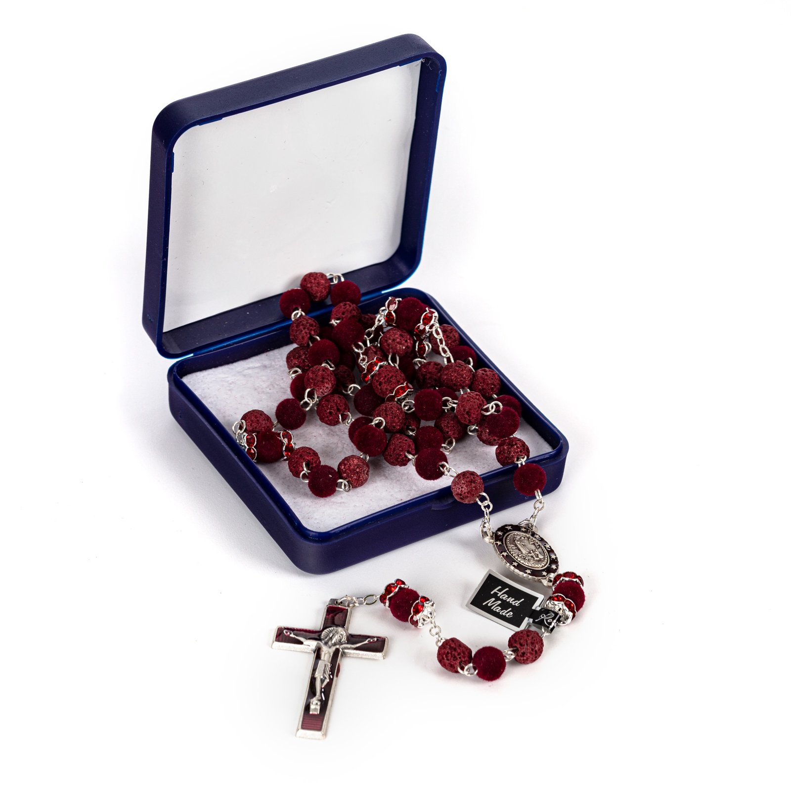 Terço de Pedra Natural Vulcânica de Lava e Veludo c/ Pai Nosso Anéis Strass